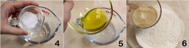 In the remaining water, dissolve the fine salt 4 and 2 tbsps of extra virgin olive oil 5. Add the yeast mixture to the sifted flours 6