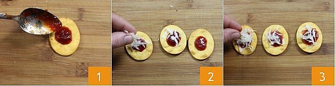 To prepare the spicy flatbread recipe, place about 1/2 tsp of pepper jelly on each tomato flatbread 1; coarsely grate the spicy provolone and place a small pile on the jelly 2. Finish with a sprinkle of hot paprika on top 3. Et voilà... the spicy flatbreads are ready to heat up your buffet!