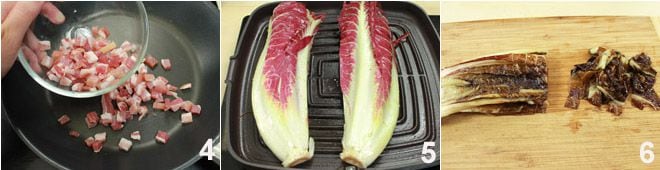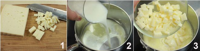 To assemble the flatbreads with Asiago cream, radicchio, and bacon, start by preparing the Asiago cream: cut the cheese into cubes 1, then in a heavy-bottomed saucepan (or using a double boiler), melt the pat of butter, add the milk 2 and the Asiago cut into small cubes 3. Heat over low heat, continuously stirring with a spoon until the cheese has completely melted. If the mixture is too liquid, add a teaspoon of flour. The result should be a thick sauce; finally, pepper to taste.