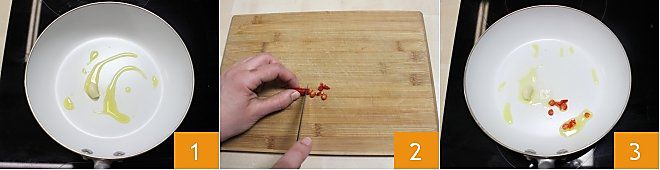 To make the flatbreads with shrimp, garlic, oil, and chili, pour a drizzle of extra virgin olive oil in a non-stick pan and sauté a previously peeled clove of garlic 1. Meanwhile, take the fresh chili and, after rinsing it, slice it thinly 2, then sauté it in the pan along with the garlic 3.