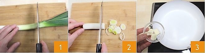 To prepare the flatbreads with julienne of leek and speck, take the leek, trim and clean it well, remove the green leaves 1 and slice it rather thinly 2. In a non-stick pan, melt the butter 3,