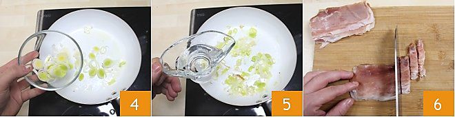 add the leek and let it soften with a bit of water, over low heat for 5 minutes (4-5). Now cut the speck into julienne strips 6