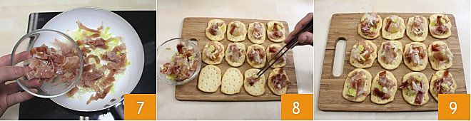 and add it to the leek 7. Mix everything with a wooden spoon to blend the flavors well, then continue cooking over medium heat for 6-7 minutes. After this time, take the flatbreads and, using kitchen tongs, place a bit of speck and leek mixture on each of them 8. The flatbreads with julienne of leek and speck are ready 9, we recommend serving and enjoying them immediately!