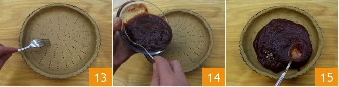 Quickly reshape the excess pastry and set it aside. Prick the bottom of the tart with the tines of a fork 13 and pour the strawberry jam into it 14. Level it with the back of a spoon and spread it over the entire surface of the mold 15.