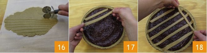 Roll out the reshaped pastry with a rolling pin until you get a thickness of about 0.2 inches and cut strips of pastry with a pastry cutter 16. Place the pastry strips over the jam, creating a lattice pattern (17-18).