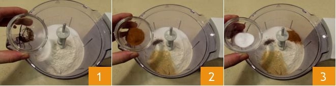 To prepare the spiced tart with strawberry jam, start by making the pastry. In a food processor, add the flour, ground cloves 1, ginger, ground cinnamon 2, and baking soda 3. Then also add the sugar and a pinch of salt.