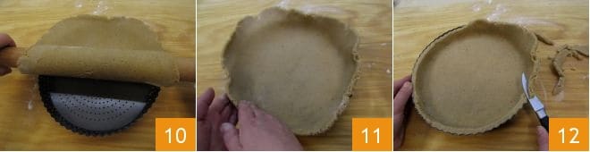 Now take a perforated 9-inch pan (if you don't have one, use a pan of the same size, but you will need to butter and flour it). Using the rolling pin wrapped with the pastry, lift it and lay it over the pie dish 10. Use your fingertips to adhere the pastry well to the edges 11 and with a knife, remove the excess that comes out of the mold 12.