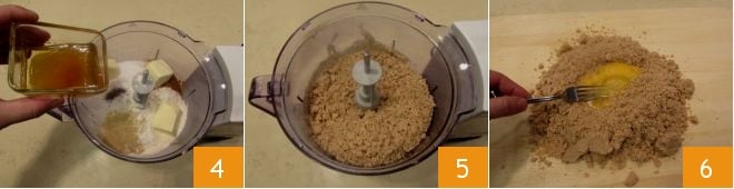 Grate nutmeg into the mixer as well, then add cold, refrigerated butter in cubes and honey 4. At this point, turn on the mixer, being careful to pulse intermittently so as not to overheat the dough. Mix until you create a sandy texture 5. Then pour it onto a work surface and form a fountain, to which you will add the whole egg and beaten yolk. Mix the dough first with a fork 6 and then with cold hands, quickly to avoid warming it too much.
