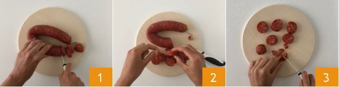 To make the spicy salami fritters, first cut the spicy salami into slices about half an inch thick 1, remove the casing 2, and then cut the slices into small cubes 3.