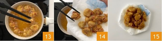 then turn them over and continue cooking for another minute until golden 13. Drain them on a plate lined with paper towels to absorb the excess oil 14. The spicy salami fritters are ready to be enjoyed 15!