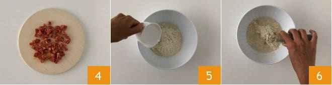 Set aside the chopped salami 4 and prepare the batter: in a bowl, pour in the flour and sparkling water 5, season with salt and ground black pepper 6.