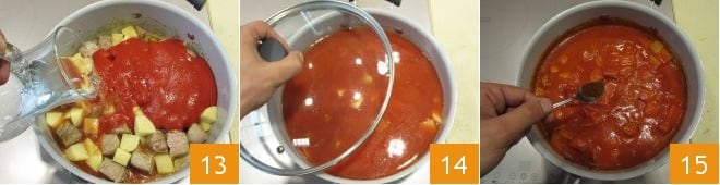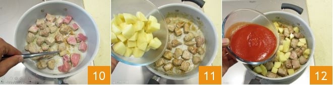 Brown the meat pieces over high heat first on one side and then on the other 10, turning them with kitchen tongs for even cooking, so as to avoid piercing the meat with a fork and letting the juices escape. Once the cubes are well browned, add the diced potatoes 11, then the tomato puree 12
