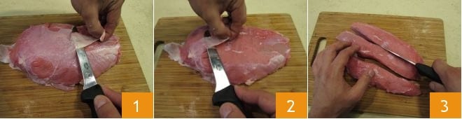 To prepare the spicy stew with peas and potatoes, start by removing the fat from the veal meat present on the tendons 1, then with a sharp knife, trim the excess fat from the tissues 2. Cut the meat into three parts 3: in this case, you might position the piece of meat lengthwise on the cutting board.