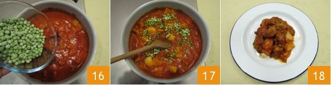 then the frozen peas 16 and let it cook for another 20 minutes, stirring occasionally 17. Adjust salt and possibly pepper, then serve your spicy stew with peas and potatoes hot 18.