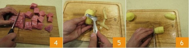 Then cut in the opposite direction (horizontally) to obtain cubes of about 1 inch 4. Wash the potatoes thoroughly under running water, dry them, peel them 5, then cut them into chunks 6 just as you did with the veal meat.