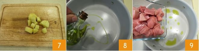 Set the potato chunks aside 7 and heat the oil in a large saucepan 8; as soon as the oil is hot, add the meat cubes 9.