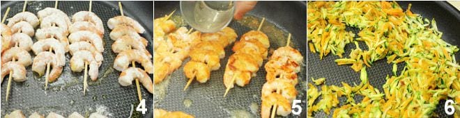 In a pan, put the oil and add the shrimp skewers 4, deglaze with wine 5, season with salt and pepper. Remove the skewers and keep them warm, add more oil to the pan, and add the vegetables which should cook for just a few minutes to remain rather crispy 6, then season with salt.