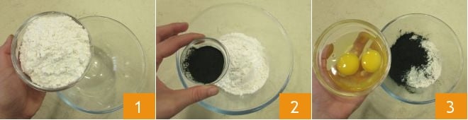 To prepare spirulina pasta, start by making the fresh pasta: sift the flour into a bowl 1, then add the spirulina 2 and the eggs 3.