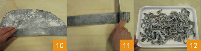 roll it up to create a log 10 and then, using a dough scraper or a smooth-bladed knife, make tagliatelle about 1/5 inch thick 11. Unroll your tagliatelle and place them on a tray 12.