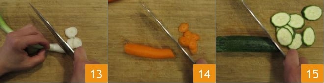 Now, prepare the dressing: slice the spring onion 13, the previously peeled carrots 14, and the zucchinis 15.