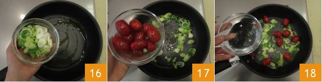 In a pan, gently sauté the spring onion for a few minutes with a drizzle of oil 16, add the whole cherry tomatoes 17, and increasing the heat, pour in a little water (about a coffee cup) 18.