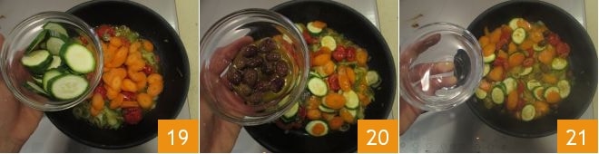 Lower the heat and start crushing the cherry tomatoes. At medium heat, add the zucchinis, carrots 19, and olives 20. Salt and pepper the dressing and add another coffee cup of water. Lower the heat again and cook the dressing for about 20 minutes, being careful to add a little more water if it dries out too much 21. Meanwhile, place a pot full of salted water on the stove, which will be used to cook the pasta.