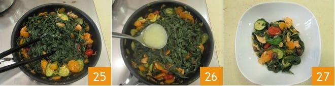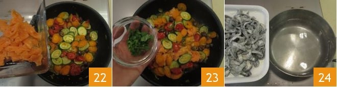 After the dressing's cooking time, turn off the heat and add the smoked salmon, broken into pieces by hand 22 (the salmon is added off the heat, as it will only need to exploit the warmth of the dressing), then scent with basil and mint leaves 23. Cook the pasta 24 for about 4-5 minutes at most