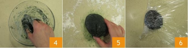 Knead until the ingredients are well combined 4. Flour the work surface and continue working the dough here 5. Form a ball and wrap it with plastic wrap 6. Let the dough rest in the refrigerator for at least 30 minutes.