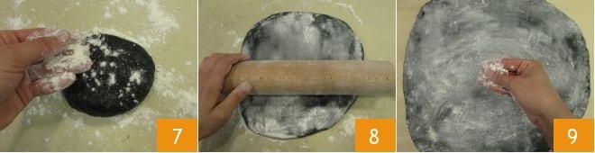 After the 30 minute rest period, transfer the dough to a well-floured surface 7 and roll it out with a rolling pin 8 until it is 1/32 inch thick (do not skimp on the amount of flour if needed, as spirulina tends to moisten the dough significantly). Add more flour to the surface of the rolled-out dough 9,