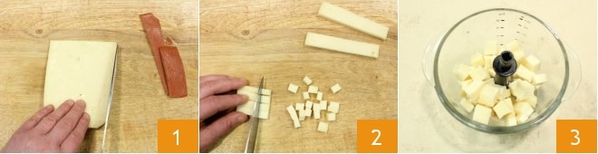 To make the spring vegetable lasagna, start by preparing the fondue: take the Fontal cheese 1, cut it into cubes 2, and place them in the mixer 3