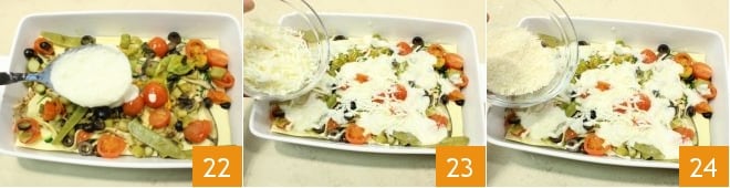 Cover the lasagna with the sautéed vegetables, add grilled zucchinis and eggplants, cover with the Fontal fondue 22, the mozzarella and provolone mix 23, and the other Parmesan and Emmentaler mix 24.