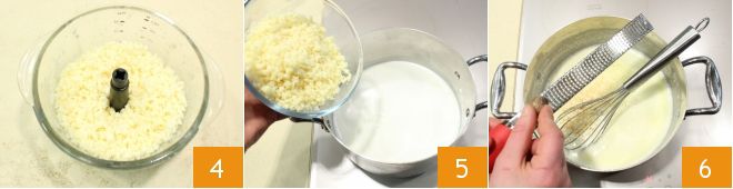 and chop them 4. Place a small saucepan on the stove, pour in the milk, and heat it over low heat. When it is about to boil, turn off the heat and add the chopped Fontal 5; mix with a whisk to melt the cheese and flavor with nutmeg 6;