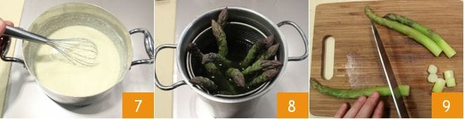 when the cheese has completely melted and the sauce is smooth and lump-free 7, the fondue will be ready. Now take care of the vegetables: wash and peel the asparagus stalks, then use a knife to remove the tough ends, trimming them; cook them for a few minutes in a special asparagus pot with the tips out of the water 8, draining them while still crunchy. Once they have cooled slightly, cut the stalks into slices 9 and leave the tips whole.