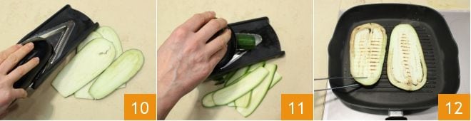 Wash eggplants and zucchinis, removing the ends, and cut them lengthwise into slices 1/8-1/4 inch thick (10-11); then heat a grill and cook for a few minutes per side both the eggplants 12