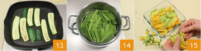 and the zucchinis 13. Wash the snow peas (or you can use green beans as an alternative), trim the two ends, and steam them while leaving them crunchy 14. Wash and dry the zucchini flowers, then gently remove the stem and pistils 15.