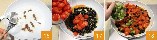 In a large pan, pour some extra virgin olive oil along with the anchovy fillets drained from their oil; add the crushed garlic 16 and let it all melt over very low heat. Then add the pitted olives cut into slices and the cherry tomatoes halved 17. Cook the ingredients, keeping the cherry tomatoes firm, then add the basil torn by hand, the asparagus stalks sliced 18 (keep the tips for the final layer of the lasagna),