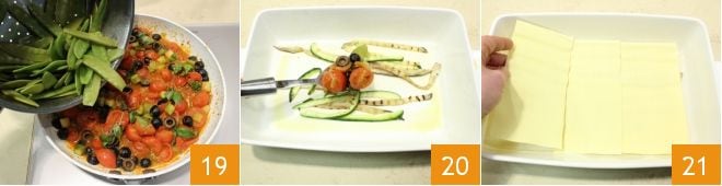 the snow peas 19, and finally the zucchini flowers from which you removed the central part. Turn off the heat after a couple of minutes, adjusting for salt and pepper. Finally, grate the Parmesan and Emmentaler and mix them in a bowl for a tasty blend. Do the same with the provolone and mozzarella to create another melty mix. Take a rectangular baking dish measuring 8x12 inches and brush the bottom with some extra virgin olive oil; add a ladle of vegetables 20 and then start forming the first layer of lasagna with the egg pasta sheets 21.
