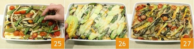Continue this way until you complete the 3 layers, and on the final one distribute the reserved asparagus tips 25, the zucchini flowers, and the grated cheese 26. Bake the lasagna in a preheated static oven at 350°F for about 30-40 minutes (or in a fan oven at 320°F for 20-30 minutes). Once cooked, remove the spring vegetable lasagna from the oven and let it cool slightly before serving 27.