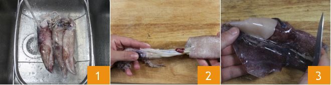 To make the squid with olives, start by cleaning the squid following our cooking school guide: How to clean squid. Rinse the squid under running water 1, then gently detach the head from the body with your hands and set it aside 2. Also remove the transparent cartilage pen found in the body. Rinse the squid again under running water and remove the innards. Finally, remove the outer skin 3.
