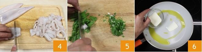 Now that your squid is clean, cut it into rings about half an inch thick 4. Chop the shallot, garlic, and parsley together 5. Heat the oil and butter in a pan 6,