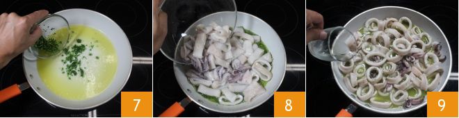 add the chopped shallot, parsley, and garlic 7, sauté for a few seconds, then add the squid 8 and brown them for five minutes over medium heat. After five minutes, deglaze with white wine 9, let it evaporate,