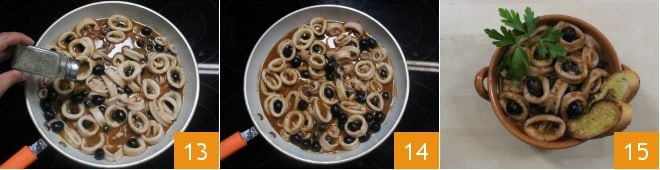 and pepper 13 to finish the preparation. Your squid with olives is ready 14; serve it with slices of toasted bread and enjoy it while hot 15.
