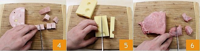 Proceed now to prepare the skewers: cut the mortadella, Emmental cheese, and pork loin into cubes about half an inch each side, which you will use alternately to prepare the skewers (4-5-6).