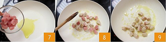 In a pan, add a drizzle of olive oil and sauté the pork loin cubes for a few minutes 7, turning them often to brown all sides (8-9). Remove from the heat and let them cool before starting to assemble the skewers.