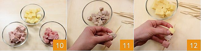 Now that you have all the ingredients ready 10, take 18 skewers and start threading a cube of mortadella, a cube of pork loin 11, and a cube of cheese 12 onto each, pressing them together well to keep them close. You can choose to place the cheese cube in the middle to reduce the risk of it melting during cooking.