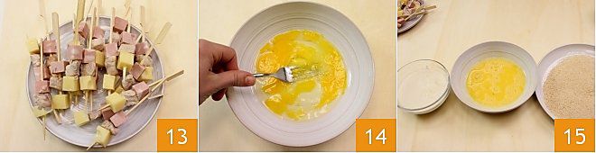 Place the 18 assembled skewers on a plate 13 while you prepare the ingredients for the coating: in a shallow dish or bowl, beat the eggs with a pinch of salt 14. In another shallow dish or bowl, place the breadcrumbs. You will then have three bowls with the necessary ingredients to "dip" the skewers before frying them 15.