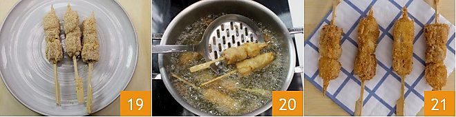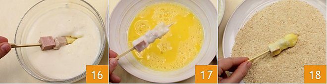 In order, dip each skewer first in the béchamel sauce you set aside 16, then in the egg 17, and finally coat them in the breadcrumbs 18.
