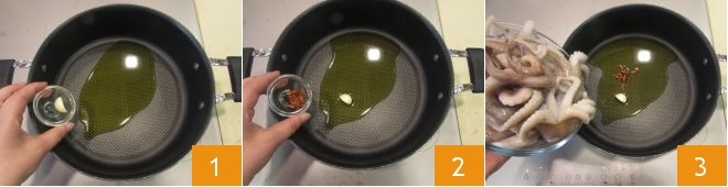 To make the stewed baby octopus, first get a large saucepan, pour in the oil, the peeled whole garlic clove 1, and the dried chili peppers 2. Let it flavor for a few moments, then add the cleaned baby octopus 3