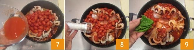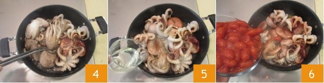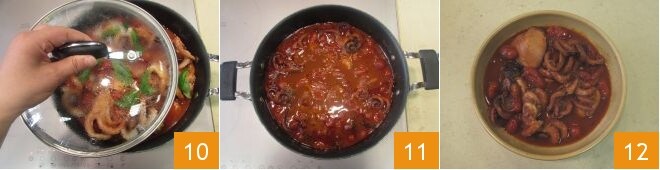 Cover the baby octopus with the lid 10 and cook over low heat for about 2 hours. After this time, remove the lid and continue cooking for another 30 minutes, keeping the heat low. Once the cooking is complete 11, you can serve your stewed baby octopus hot 12.