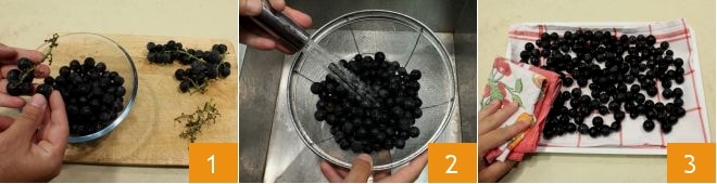 To prepare the strawberry grape liqueur, start by removing the grapes from the stems 1; place them in a colander and rinse well under cold running water 2. Put the washed grapes on a tray and quickly dry them with a kitchen towel 3.